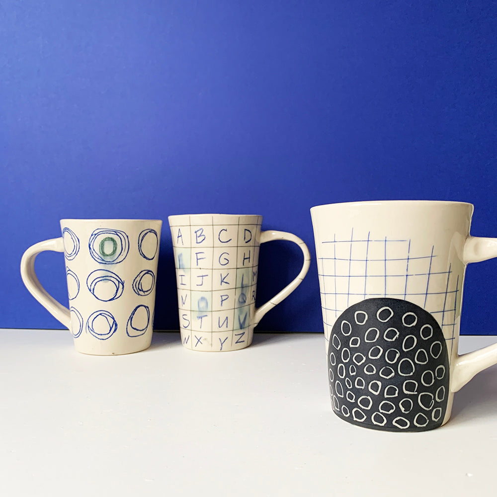 Customers love blue. We potters joke and call blue glaze money blue, because if you offer blue it will become your best seller. Blue has always been my best seller, but I never was a fan until lately. More and more I am drawn to blue! Like these subtle blue lines on this mug.