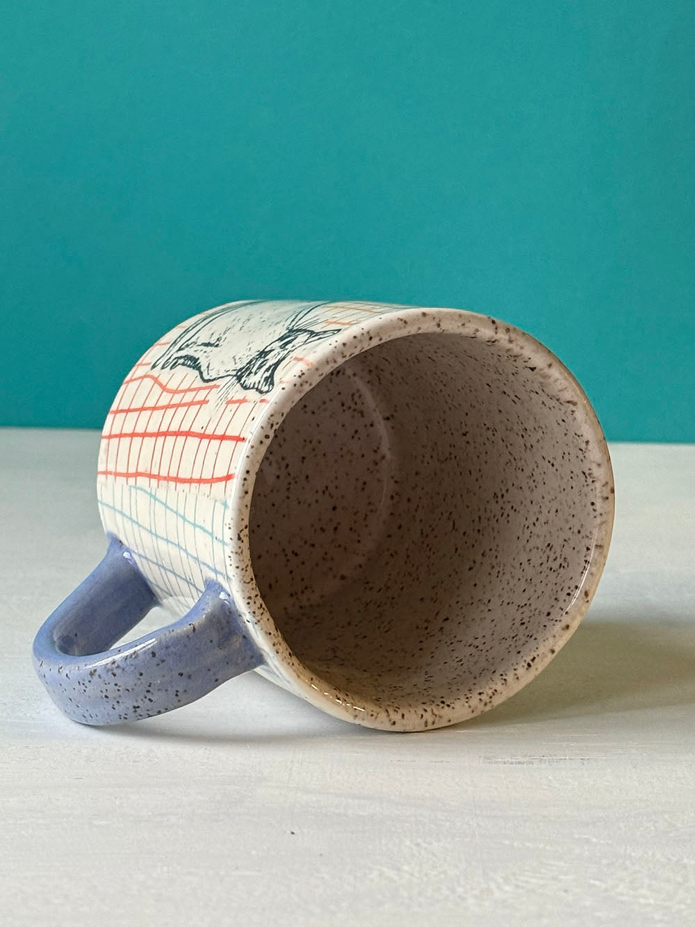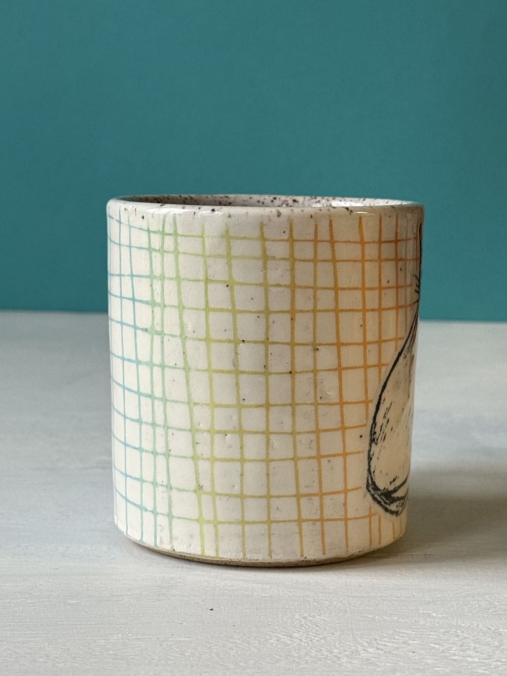 Each mug is made from stoneware clay and decorated with a cat and a rainbow grid. The mug measures 3.5" high and 4" wide and holds 13oz. It is microwave and dishwasher safe.