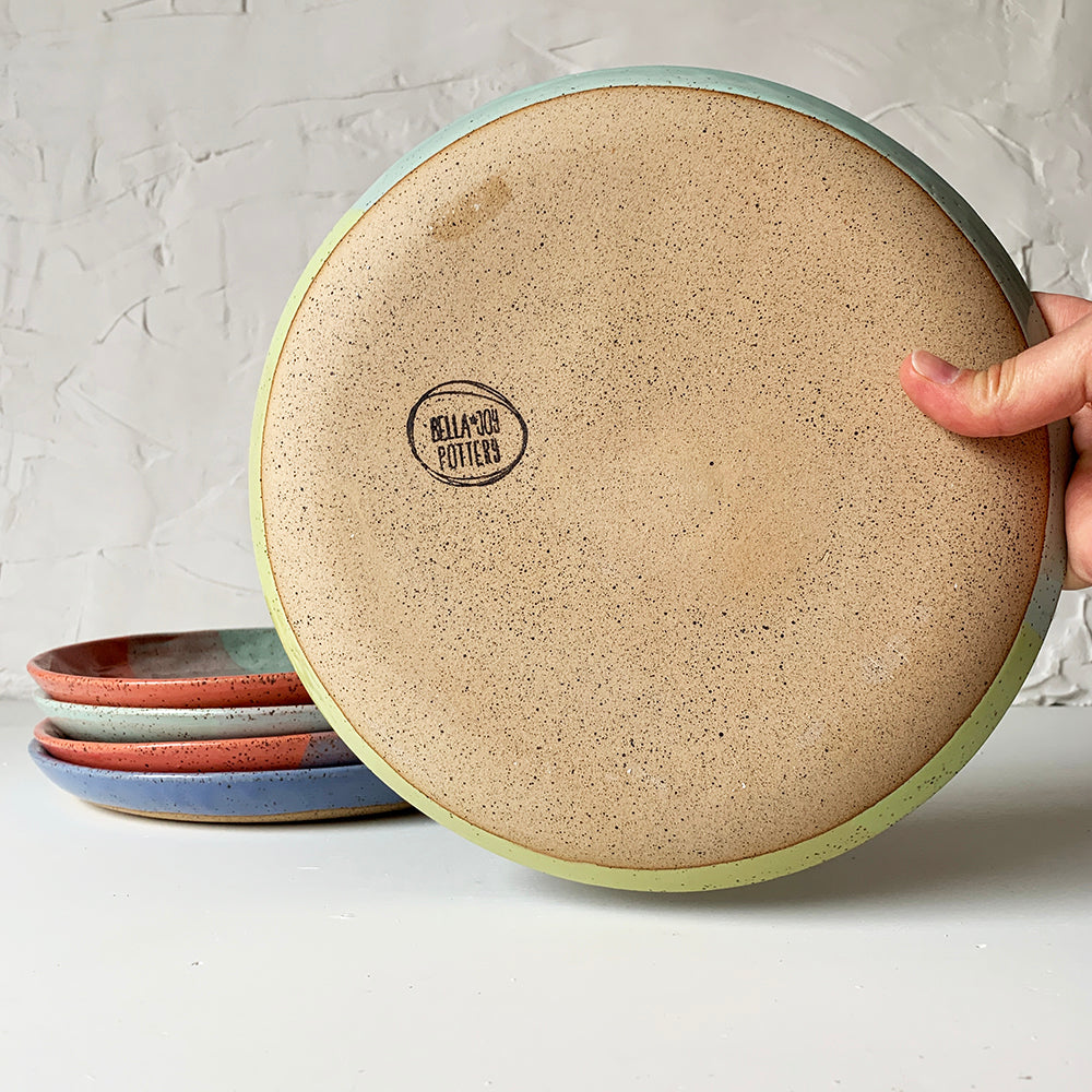 Each handmade large plate is 10" wide and 1" high.