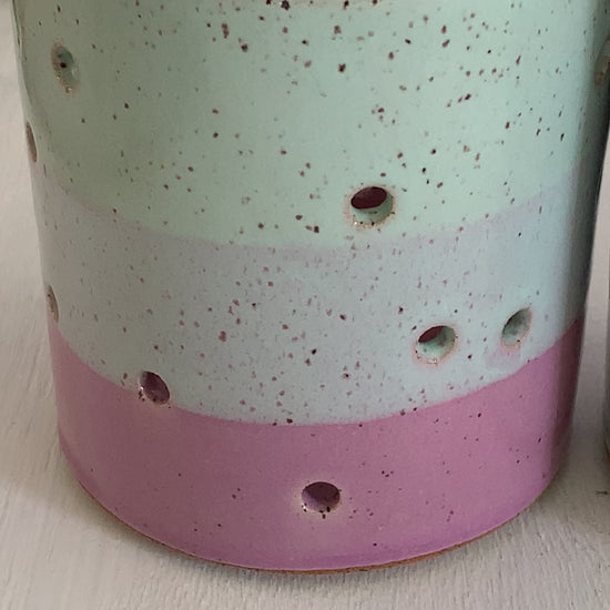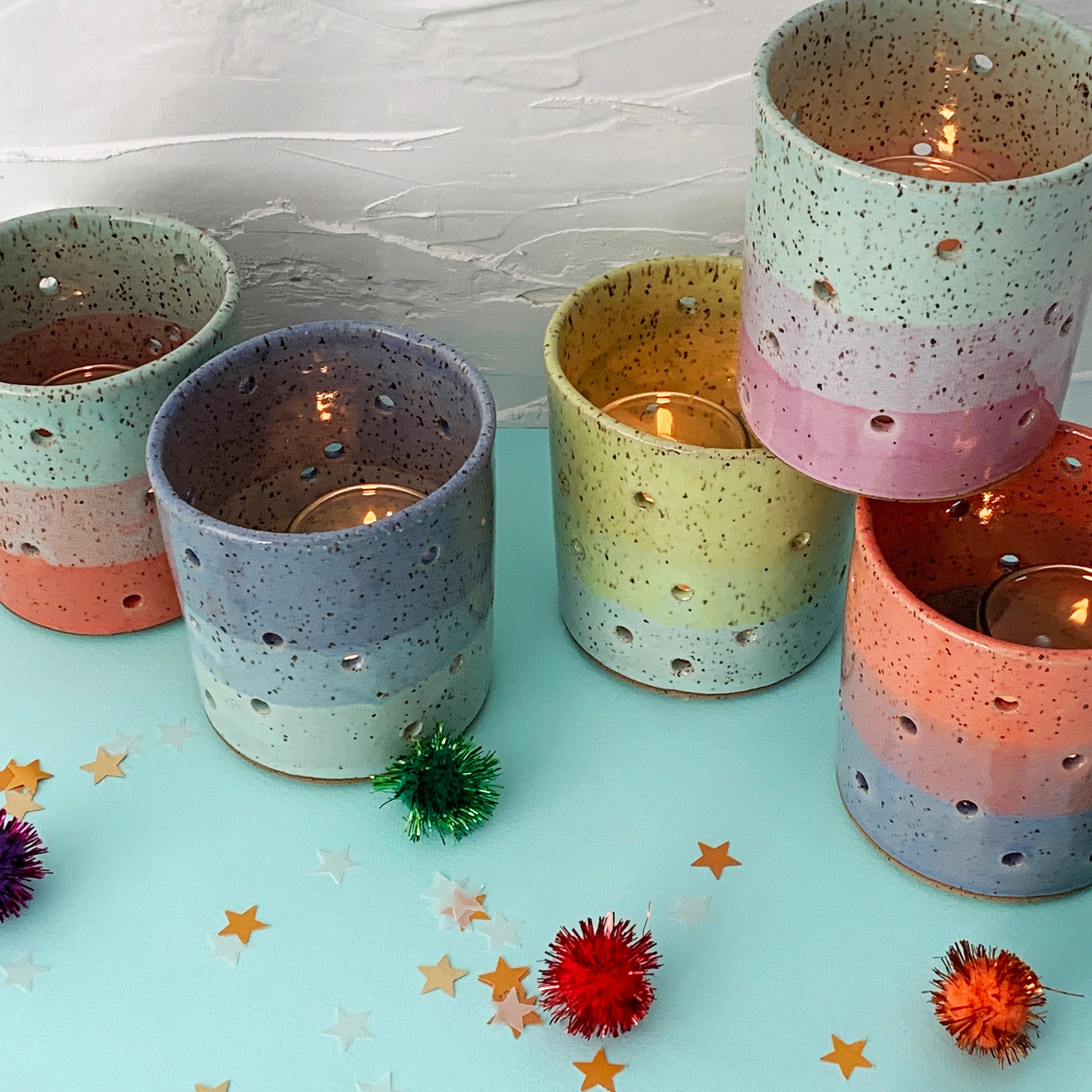 Each handcrafted candle holder has a fun and free pattern of circles on it, reminiscent of confetti to let your candle light flicker about you outdoor (or indoor) evening activities. Great for citronella candles too!