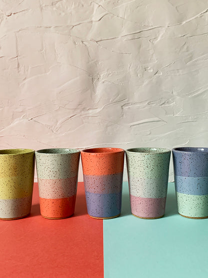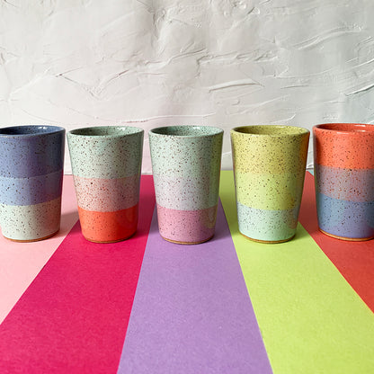 Add a splash of color to your drinkware with these fun stoneware cups! The perfect cup for juice, wine, or tea.