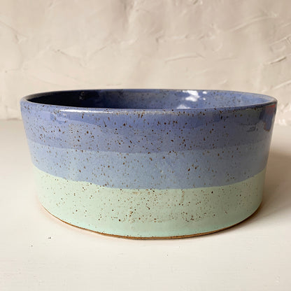 This handmade large stoneware bowl is 4" high and 9" wide.
