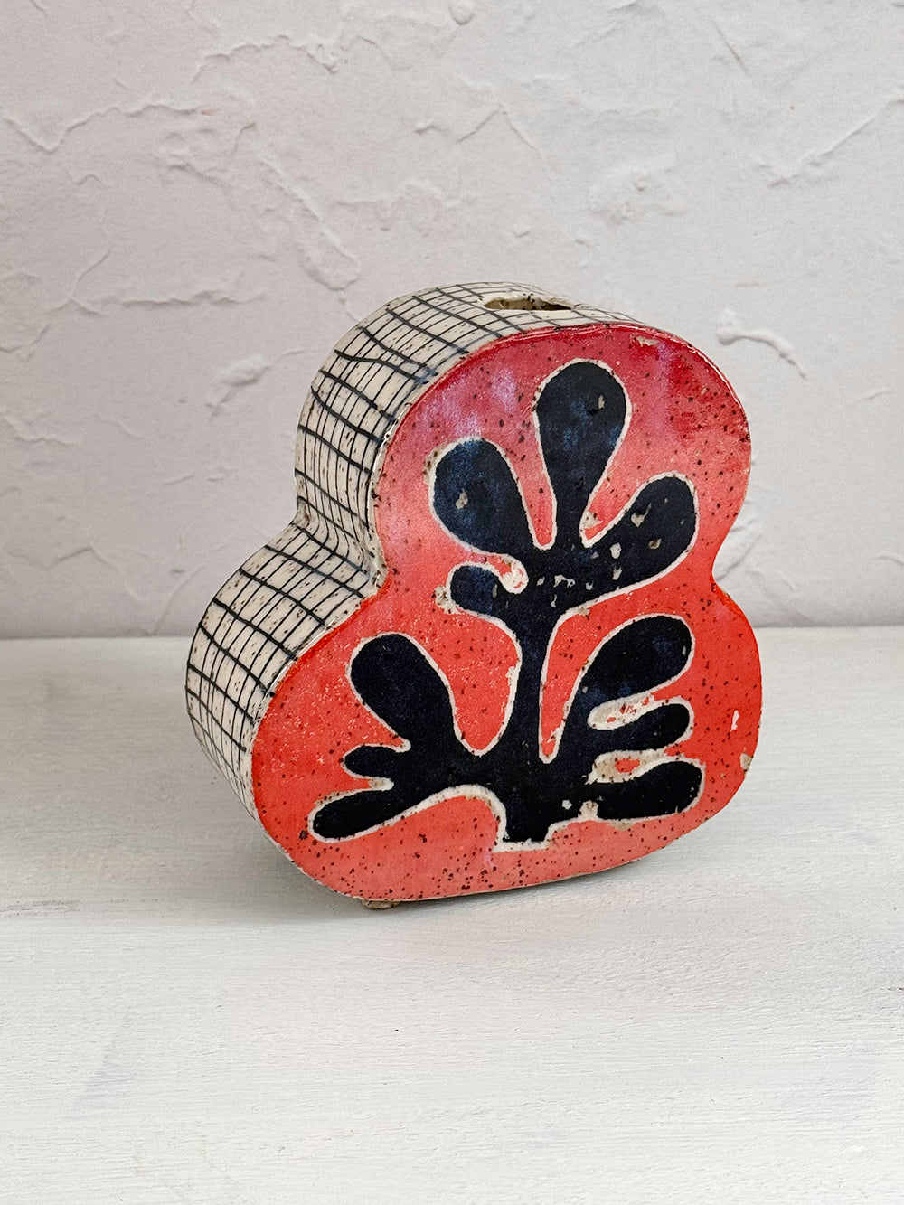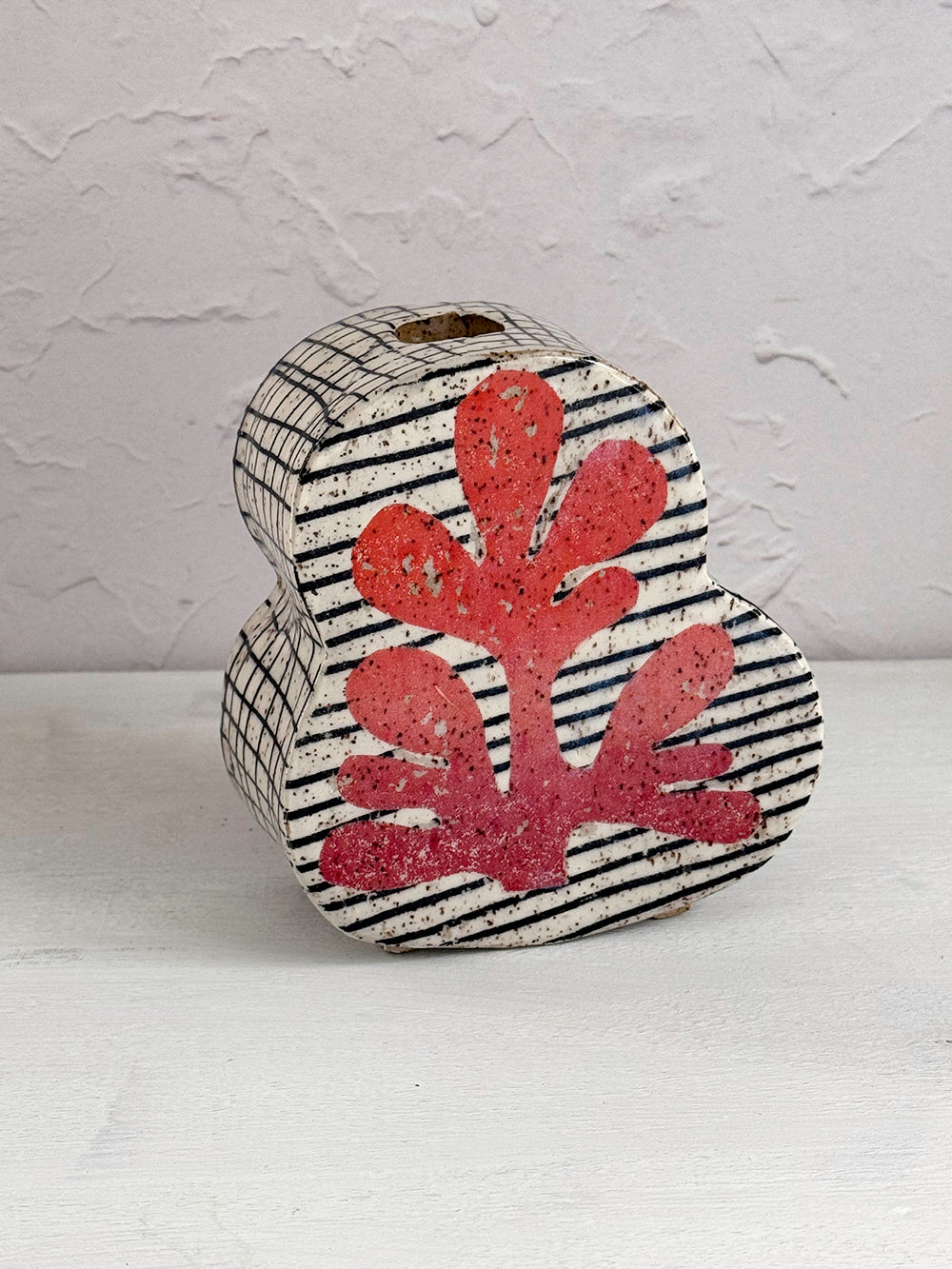 This handmade flower vase is decorated with screen printed images and various colorful underglazes, creating a truly unique piece.
